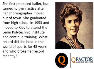 She is Larissa Latynina and she held the record of the most number of medals in the Olympics(18) until Michael Phelps broke it with a silver in London 2012.